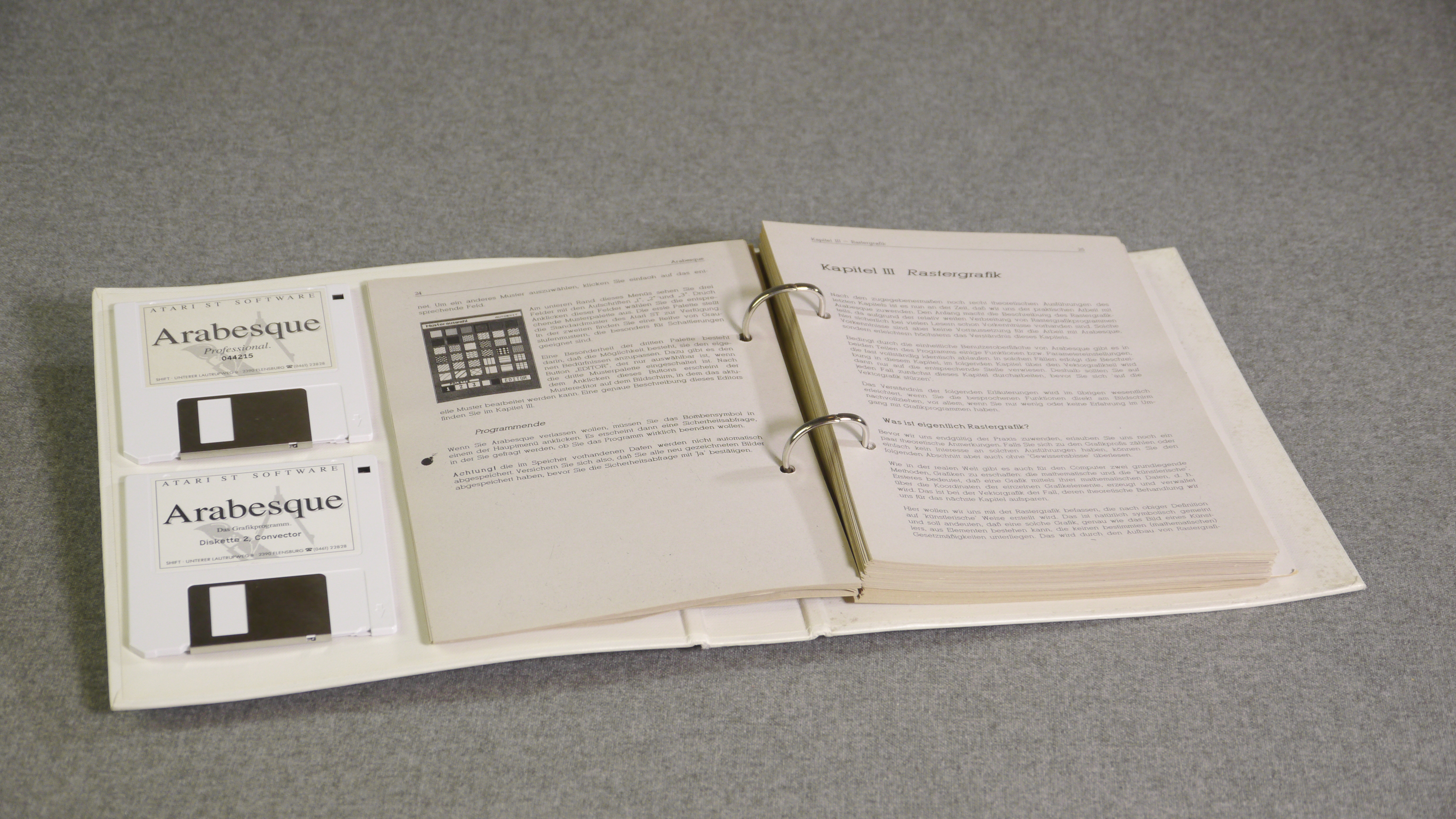 2 3,5 Zoll Disketten in Papiertasche: "Professional 044215" und "Diskette 2, Convector".